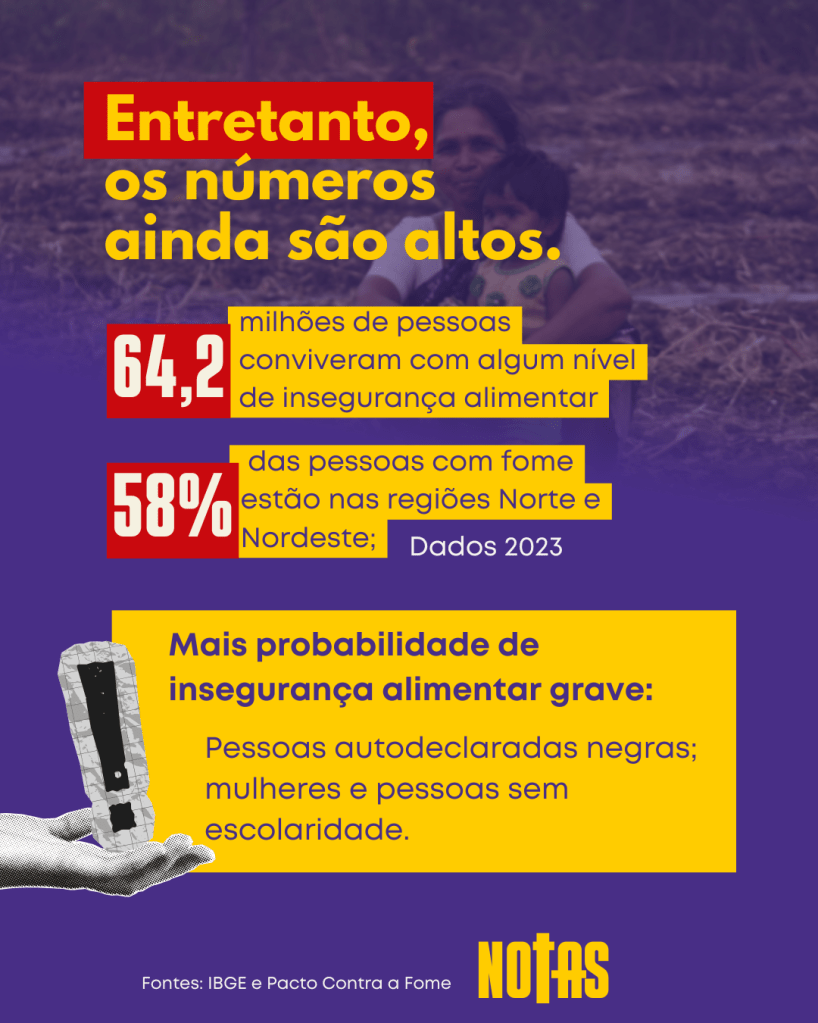 Apesar disso, os números ainda preocupam. Segundo dados do IBGE e do Pacto Contra a Fome (2023), cerca de 64 milhões de brasileiros enfrentaram algum nível de insegurança alimentar nos últimos anos. Desses, 58% vivem nas regiões Norte e Nordeste.